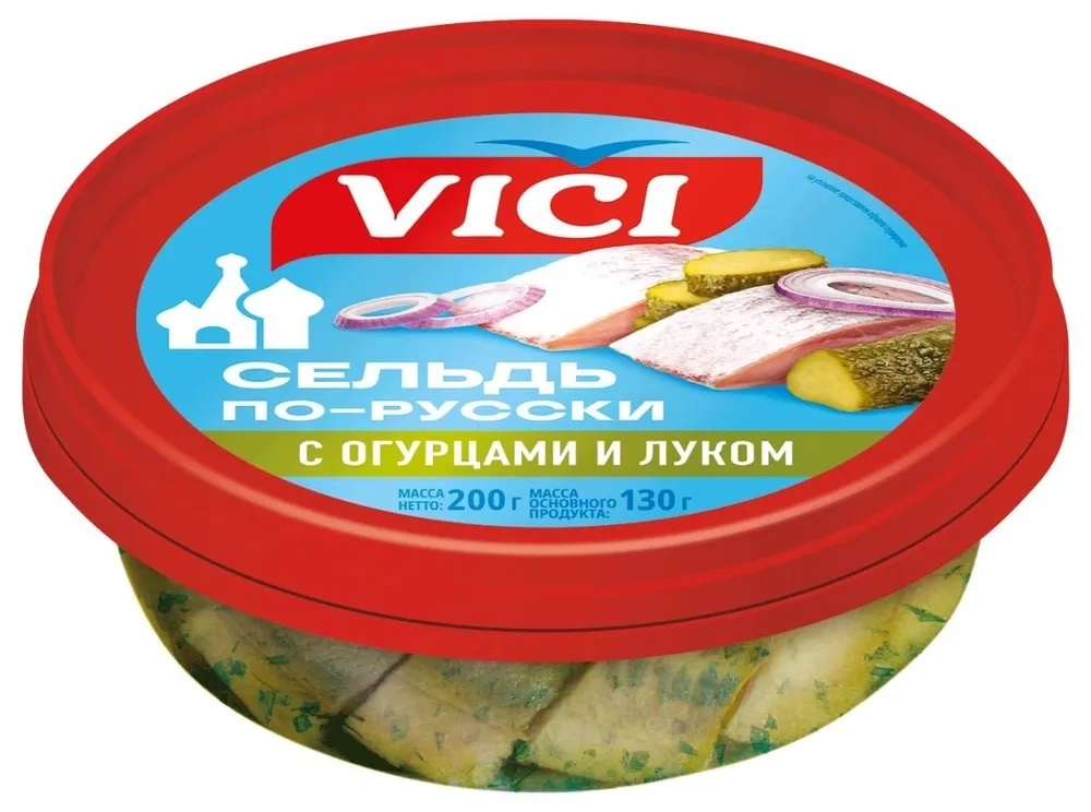 Сельдь По-Русски ф/к в масле с маринованными огурцами и луком 200г, VICI